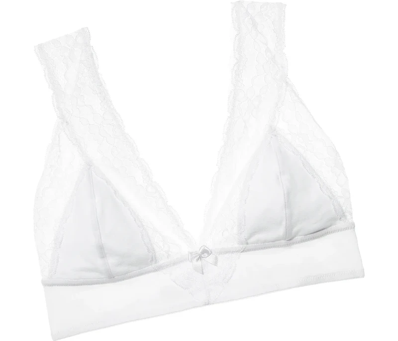 The Blakley bralette is a romantic and sexy style crafted from delicate white lace with bow details. This cotton bralette offers a comfortable and beautiful option for any day. (Available in sizes XS-XL.)