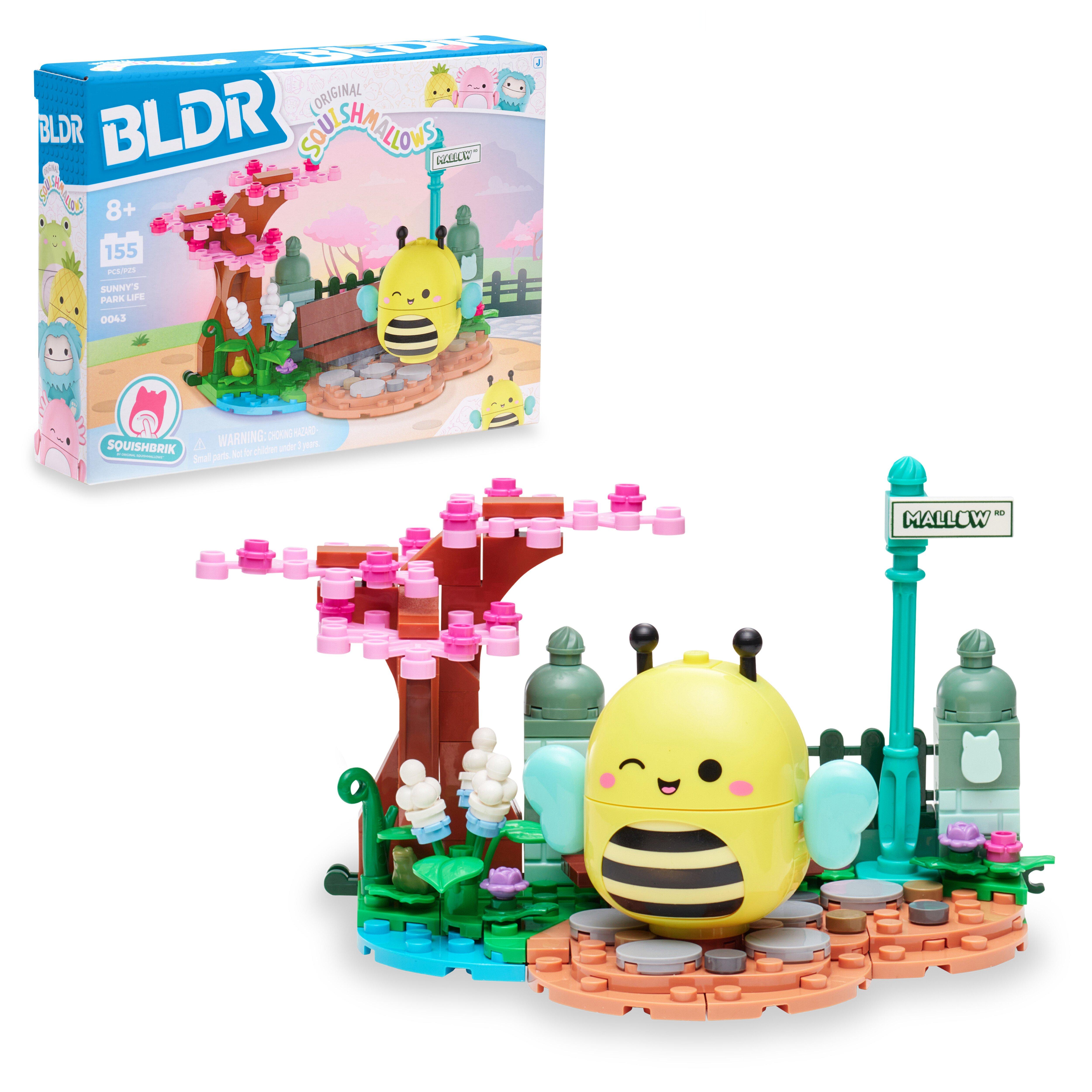 ake a stroll through a botanical garden with Sunny! This first-of-its-kind Squishmallows buildable playset, modeled after an afternoon in the garden, features beautiful scenic features like pond flowers and a cherry blossom tree. Play with or display the included Squishmallows buildable figure Sunny—featuring a squishable belly powered by SquishBrik by Original Squishmallows—gazing at the pond, people-watching on the park bench, or wherever your imagination takes you. BLDR bricks are compatible with all major construction brands, ensuring endless possibilities for creativity. Join the Squishmallows Squad with this exciting playset—perfect for kids and fans who love to build, imagine, and play!