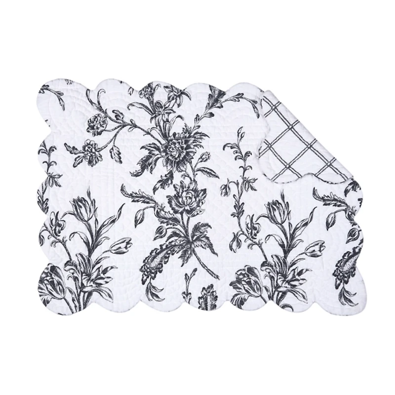 Traditional design gets a modern update with the set of Bleighton Black Floral Placemats. Their reverse features simplistic trellis patterns, making it easy to switch up the look of a tablescape in an instant. Set includes six (6) placemats Placemats measure 19L x 13W in. each Crafted of cotton Floral motif design Quilted stitching Trellis reverse pattern Scalloped edges Hues of black and white Care: Machine washable, cold. Machine dry low, gentle or air dry. This item is available at Kirklands.com only, not available in stores. Please note: this item cannot be shipped to APO/FPO addresses.