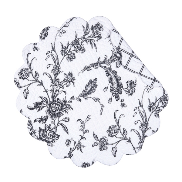 Traditional design gets a modern update with the set of Bleighton Black Round Floral Placemats. Their reverse features simplistic trellis patterns, making it easy to switch up the look of a tablescape in an instant. Set includes six (6) placemats Placemats measure 17 in. in diameter each Crafted of cotton Floral motif design Quilted stitching Trellis reverse pattern Scalloped edges Hues of black and white Care: Machine washable, cold. Machine dry low, gentle or air dry. This item is available at Kirklands.com only, not available in stores. Please note: this item cannot be shipped to APO/FPO addresses.