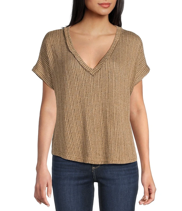APNY Ribbed Knit V-Neck Short Sleeve Sweater Top