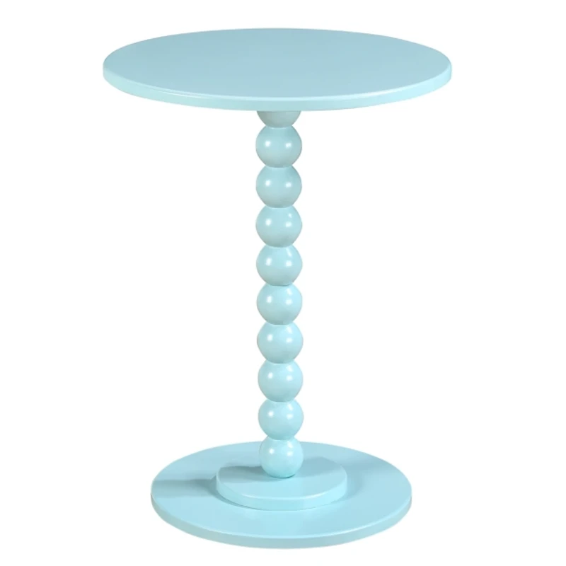 Featuring a sleek, unique style, this Blue Beaded Spindle Accent Table will bring an updated look to your home decor. Plus, its light blue finish will add a fun pop of color to any room in your home! Table measures 24.25H x 17.75 in. in diameter Crafted of solid wood and wood composite Painted light blue finish Round shape Beaded spindle base Weight: 12 lbs. Weight capacity: 20 lbs. Assembly required Not intended for commercial use Care: Dust with a soft, dry cloth. This item is available at Kirklands.com only, not available in stores. Please note: this item cannot be shipped to APO/FPO addresses.