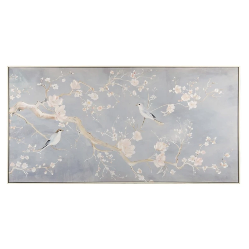 The natural elegance of this Blue Birds in Floral Framed Canvas Art Print will add life and beauty to your space. It turns any wall into a breathtaking display! Overall dimensions Width: 60.04 in. Depth: 2.17 in. Height: 30.51 in. Distinctively printed on stretched canvas White frame around wrapped canvas Features birds on floral branches Hues of blue, gray, white, and pink Print with painted embellishments Weight: 5 lbs. Hangs from back-mounted hardware Care: Dust with a soft, dry cloth. Contact your local Kirkland's store for availability. Quantities and selection may vary by location.
