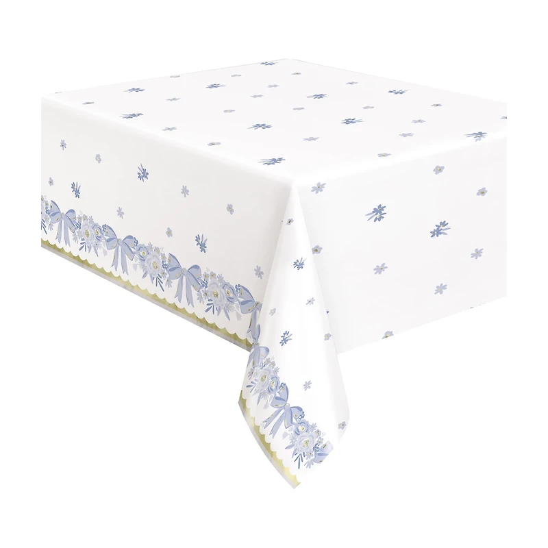 The standout feature of this table cover is its beautifully detailed border, showcasing a series of blue bows interwoven with dainty flowers and greenery. This intricate design adds a touch of whimsy and elegance, making it ideal for baby showers, birthdays, tea parties, or any gathering where you want to impress your guests.