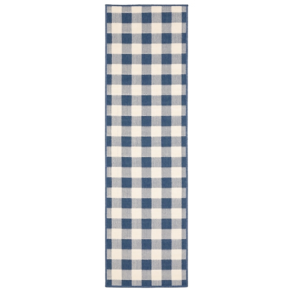 Add a vibrant farmhouse check to your outdoor décor with our Blue Buffalo Check Outdoor Runner. Its lively Blue hue will be sure to spice up those summer night parties! Runner measures 2 ft. 3 in. in length x 7 ft. 6 in. in height Crafted of polypropylene Machine made, loop pile construction Buffalo check design Hues of blue and ivory Naturally stain, fade, and water resistant Rug pad not included Care: Safe for outdoor use. If spills occur, blot as much of the stain as possible with clean cloth or paper towel. Apply mild soap and water to a clean sponge to remove the remainder of the spill. Allow area to dry. To clean the entire surface of the indoor/outdoor rug, spray with a mixture of mild soap and water and rinse with garden hose. This item is available at Kirklands.com only, not available in stores. Please note: this item cannot be shipped to APO/FPO addresses.
