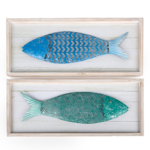 Brighten up your coastal decor with these Blue & Green Metal Fish Wall Plaques. Colorful and rustic, this set captures the lively spirit of the fish market! Set includes two (2) plaques Each plaque measures Width: 23.5 in. Depth: 1.5 in. Height: 9.75 in. Crafted of metal and wood White frame finish Feature fish with decorative designs Hues of blue, green, and white Weight: 1.65 lbs. Hangs from back-mounted hardware Care: Dust with a soft, dry cloth. Contact your local Kirkland's store for availability. Quantities and selection may vary by location. WARNING: Cancer and Reproductive Harm - For more information go to www.P65Warnings.ca.gov .