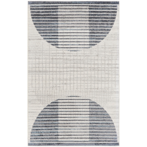 Embellish your floors with the modern style of this Blue Linear Geometric Washable Area Rug. With clean lines and a machine washable design, it will keep your space fresh! Rug measures 4 ft. in length x 6 ft. in height Crafted of polyester with a polypropylene backing Features two semi-circles Hues of white, blue, and gray Shimmering yarns shift tones in different light Rug pad not included Care: Vacuum regularly. Machine wash cold. Do nor bleach. Line dry. For rugs 8x10 or larger, use a larger capacity commercial grade machine. Not safe for outdoor use. This item is available at Kirklands.com only, not available in stores. Please note: this item cannot be shipped to APO/FPO addresses.