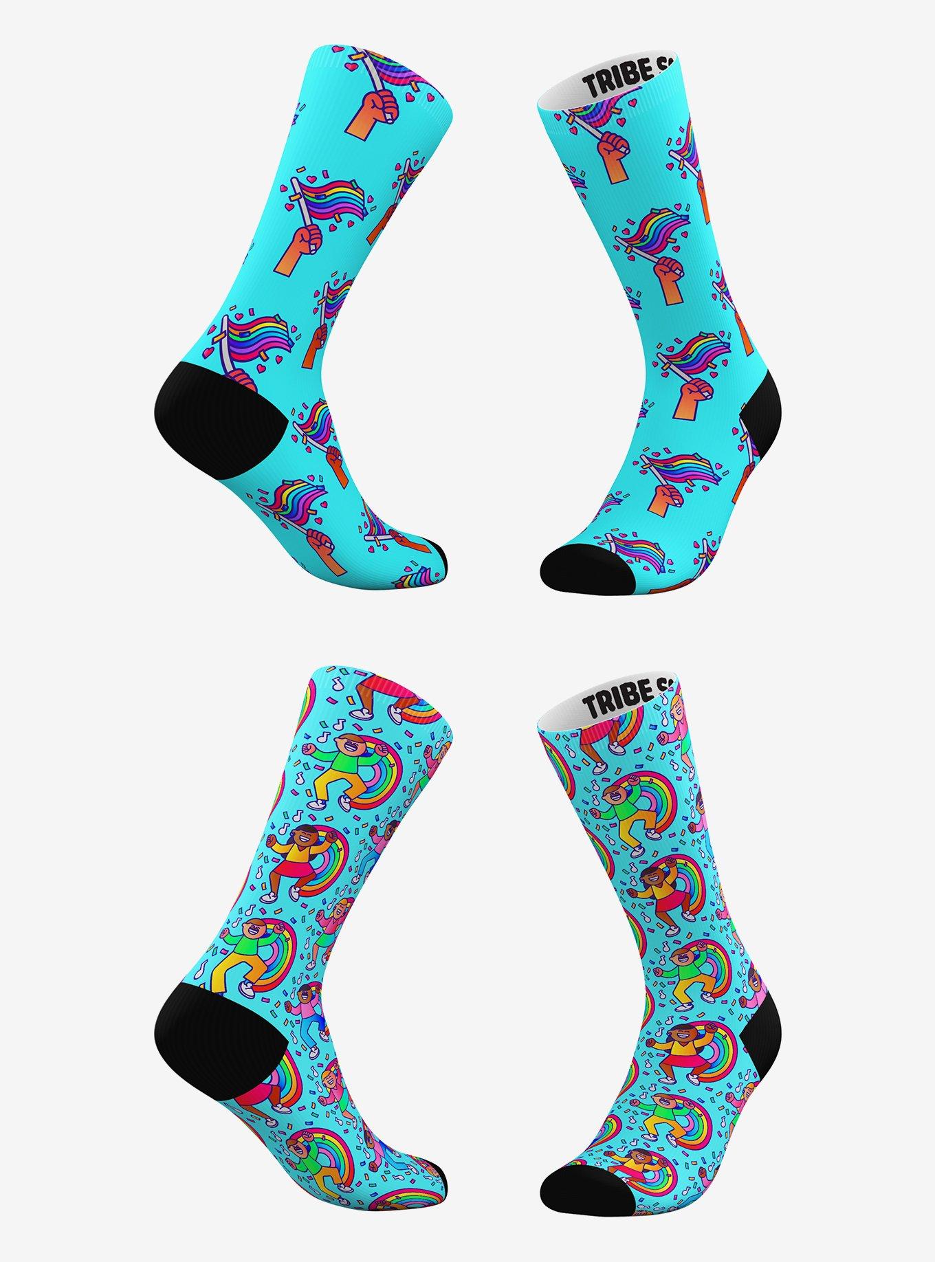 Wave that flag. Throw that confetti. Dance and sing. Celebrate pride with a 2-pack of socks celebrating the diversity championed by the LGBTQIA community. Tribe Digital Polyester Crew Socks are printed using our signature 360 DTG process (no dye sublimation) that prints vibrant, full color artwork directly onto these 200 needle knit polyester blend socks. They have a half terry cushioned bottom for extra support. One Size Fits Most, Men's US size 3.5 to 12, Women's US size 5 to 14, UK size 4 to 11.5, EU size 36 to 46. Item cannot be shipped to P.O. Boxes