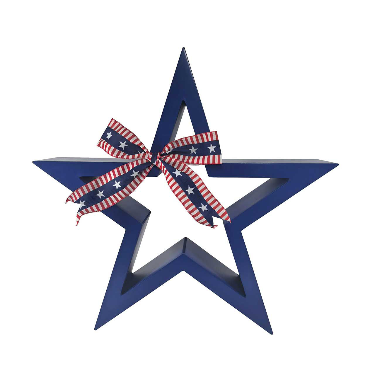 The centerpiece of this striking decoration is a bold, deep blue star, meticulously crafted from durable materials to ensure it stands the test of time. Its eye-catching design is enhanced by a charming bow that features the iconic American flag pattern, with red and white stripes and white stars on a navy blue background. This festive bow adds a touch of Americana charm and makes this piece a standout addition to any space.