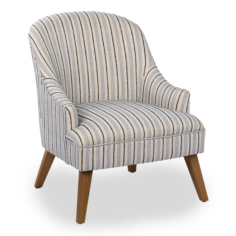 Our Blue Striped Aubrey Accent Chair features a modern silhouette and classic stripe design, perfectly embodying timeless elegance. Complete your living room with this beautiful upholstered accent chair. Overall dimensions Width: 26 in. Depth: 30 in. Height: 33.85 in. Seat measures 17.9H in. Crafted with a wood frame High-density foam fill Upholstered in fabric Light brown leg finish Features a striped pattern Angled legs Hues of ivory, blue, navy, and brown Some assembly required Not intended for commercial use Care: Dust with a soft, dry cloth. Contact your local Kirkland's store for availability. Quantities and selection may vary by location.
