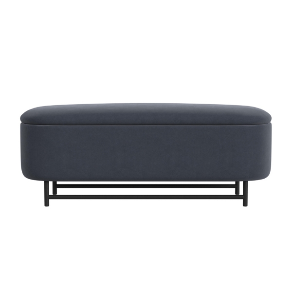 Upgrade any room in your home with this Blue Velvet Metal Storage Bench! Not only is this bench stylish, its storage compartment will help keep your space clutter-free with a modern look. Bench measures 46W x 18D x 18H in. Crafted with a metal and wood frame Upholstered in velvet and filled with high-density foam Black metal finish Dark blue upholstery finish Features a hidden storage compartment Weight: 41.6 lbs. Weight capacity: 300 lbs. Assembly required Not intended for commercial use Care: Spot clean. This item is available at Kirklands.com only, not available in stores. Please note: this item cannot be shipped to APO/FPO addresses.