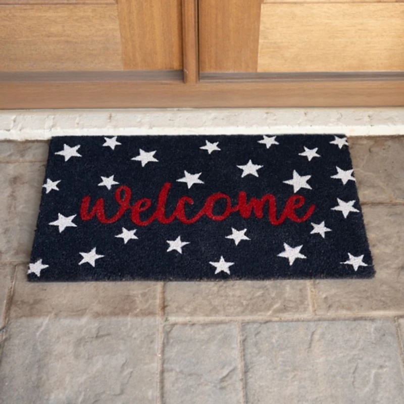 Embellish your porch for the 4th of July with this Blue Welcome Stars Doormat. Dotted with bright stars, it's perfect for greeting guests at your holiday barbecue! Doormat measures 30L x 18H in. Crafted of coir with PVC backing Features the word "Welcome" Star accents Hues of blue, red, and white Safe for covered outdoor use Care: Clean by shaking mat regularly. Avoid getting wet. To prolong the life of mat, use in dry sheltered area. Contact your local Kirkland's store for availability. Quantities and selection may vary by location.