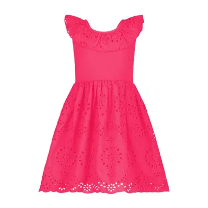 Primed for special occasions, this eyelet dress is a top choice for spring dressing. Designed with crisp cotton eyelet in a fit-and-flare design, featuring front-to-back ruffle trim at the neckline at bow at back waist and twirl-worthy finish.