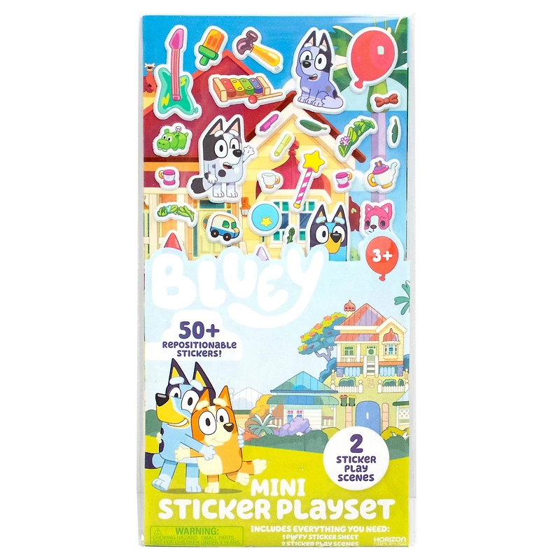 Get ready for heaps of fun with the Bluey Mini Sticker Playset — now in a pack of 6! Each playset features 45 reusable squishy stickers that little paws can play with again and again on 2 reusable sticker scenes — one of the Heeler’s front yard and another of the lively playground, just like in the show! The stickers feature everyone’s favorite characters, including Bingo, Socks, Missy, and Bluey herself, plus all their best toys like Chattermax, balloons, Polly Puppy, and more. Stick, unstick, and re-stick your way to brand new Bluey adventures — it’s like having Bluey and her mates with you for real! These sticker sets are perfect for bringing Bluey adventures on the go, just pop them in your bag for screen-free fun at the park, in the car, or at a playdate — the ultimate choice when it comes to kids travel essentials! And with a pack of 6, you’ve got the ideal Bluey birthday party supplies, party favors, Bluey birthday decorations, or group activity for any Bluey-loving bub! Recommended for Bluey fans ages 3 and up.Details:Multicolor6 sticker playsets (50+ stickers per set)For ages 3 and up