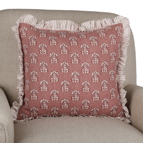 Embrace a traditional beauty with the jacquard floral pattern of this Blush Millie Floral Ruffle Pillow. Its ruffled trim will add an extra charm to any sofa or chair! Pillow measures 20L x 20H in. Crafted of cotton with polyester fill Floral pattern Hues of pink and white Striped ruffle trim Matching reverse Care: Spot clean only. Contact your local Kirkland’s store for availability. Quantities and selection may vary by location.