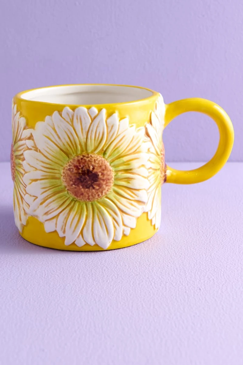 Let your kitchen glow like a sunflower field at golden hour. This hand-painted ceramic mug features a bold, dimensional yellow bloom bursting across the surface, bringing instant warmth and whimsy to your morning ritual. With layered petals in radiant golden hues surrounding a rich, sunlit center, this sculpted floral design turns every sip into a little celebration of color, light, and artistry.Each mug is artisan-painted, so subtle variations make every piece uniquely yours. The raised floral detailing creates touchable texture you can feel, while the coordinating yellow handle adds a cheerful, sunshine-kissed finish. It pairs beautifully with the matching bowl and plate, as well as the rest of our newest artisan-painted flower dish collection, for a complete, garden-inspired set that feels bright, joyful, and effortlessly charming.Perfect for slow coffee mornings, tea dates, or gifting your favorite flower lover, this mug doubles as bohemian style home decor and an affordable boho chic mug you’ll reach for again and again. It’s sunny, sculpted, and ready to bring a little petal-powered magic to your everyday routine.