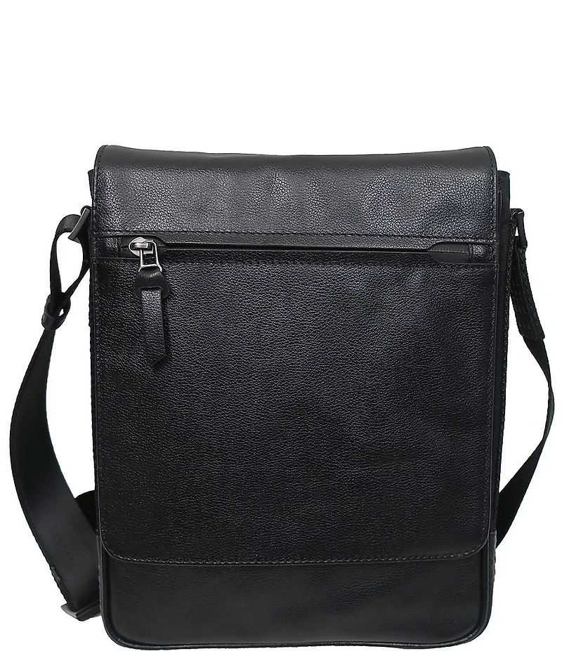 From BOCONI, the Garth Coated Zipper Leather Crossbody Bag An urban-inspired, unisex, minimalist crossbody bag for stashing the essentials Front flap closure with coated zipper pocket Adjustable crossbody bag nylon strap with signature embossed plaid Magnetic closure Padded iPad sleeve Signature plaid emboss details Interior organizer panel with RFID protected pocket, business card pocket, pen pocket and a key hook Approx. 9" x 11.25" x 2" Imported.