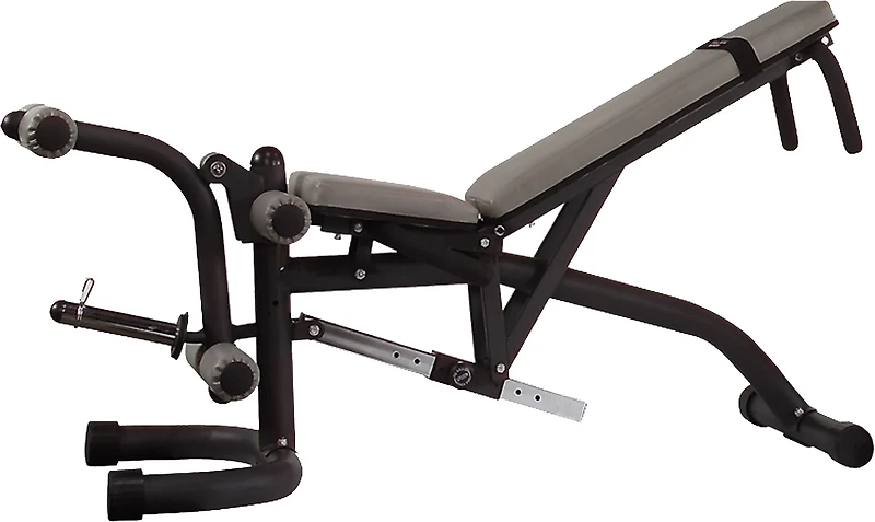 For all types of barbell and dumbbell exercises, the Body-Solid Olympic Leverage Flat Incline Decline Weight Bench has a heavy-duty, 3" round stock-steel mainframe with an extra-wide base for stability and features a 9-position back pad with a synchronized seat pad for easy adjustments. Removable leg developer with upholstered 4" x 8" rollers and oversize brass bushings for friction-free movement. Wheels offer easy mobility.