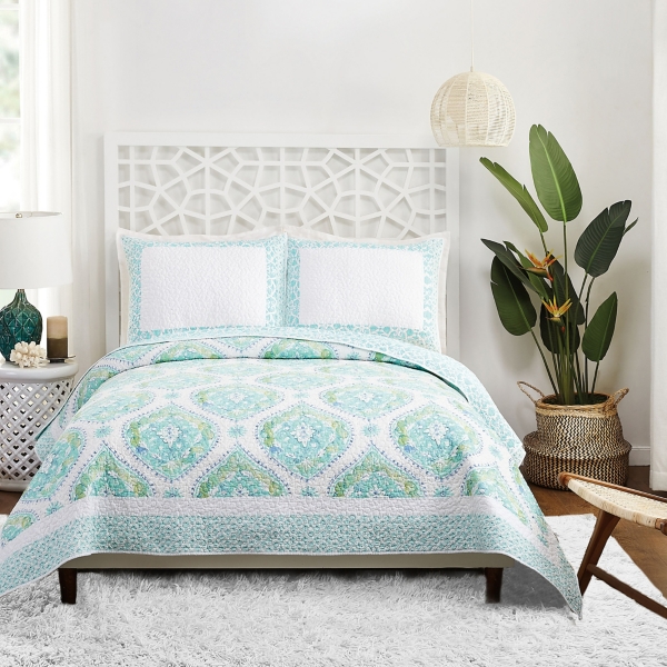 Revamp your bedroom with a vintage floral style! You'll love snuggling in the Bohemian Breeze Quilt Set's soft pastels and cozy boho pattern each night. Set includes one (1) quilt and two (2) pillow shams Quilt measures 88L x 90W in. Each pillow sham measures 20L x 26W in. Crafted of 100% cotton Features a bohemian pattern Hues of blue, green, and white Care: Machine wash cold on gentle cycle; tumble dry low. Use large capacity machine This item is available at Kirklands.com only, not available in stores. Please note: this item cannot be shipped to APO/FPO addresses.