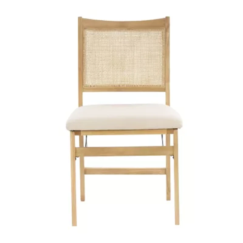 While this chair can fold up for easy storage, you will be tempted to leave it out because it looks so good. Real woven rattan cane back framed combine perfectly with the padded beige linen fabric upholstered seat. Unique metal folding mechanism allows for quick, smooth folding to be tucked away for future use. Provides extra seating in a dining room, kitchen, guest bedroom or living room. Proudly bring this out for the most formal of get togethers.
