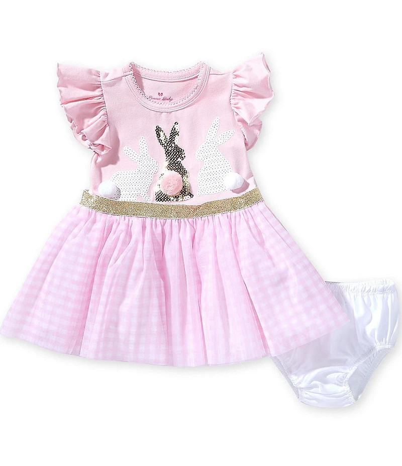From Bonnie Jean, this dress features: Round neckline Flutter sleeves 3 bunny appliqués on the front each with three-dimensional cotton tails Glitter-accented elastic waistband Full, pleated gingham-printed mesh skirt Pullover styling Includes panty Dress and panty of polyester Machine wash/line dry Imported.