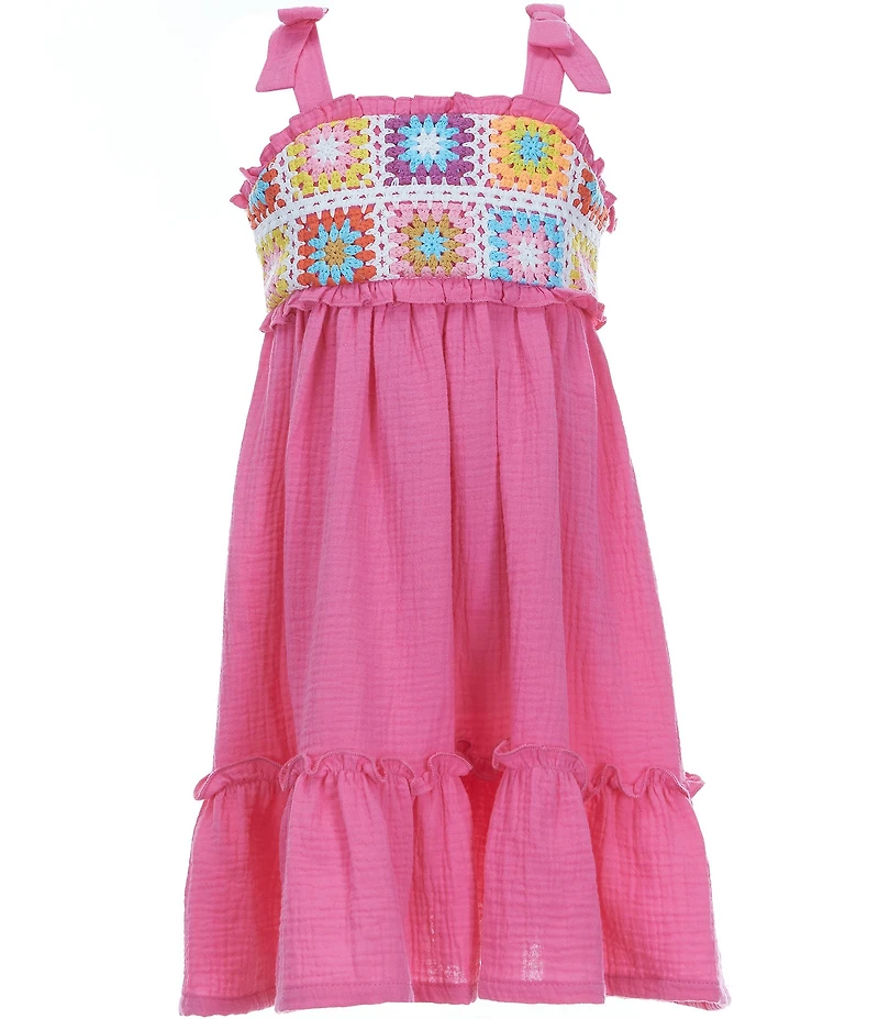 From Bonnie Jean, this dress features: Square neckline Sleeveless  Tie-accented shoulder straps Geometric-crocheted-pattern bodice Gauze skirt with ruffled, flounce hem Pullover styling Cotton Machine wash/line dry Imported.