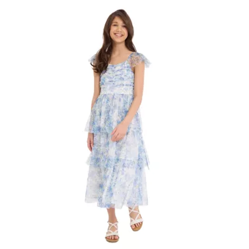 Bonnie Jean spring floral maxi length dress features a flutter sleeve bodice to triple tiered skirt.