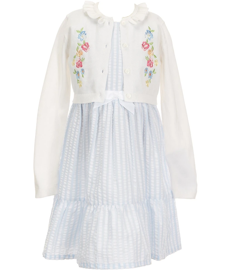 Bonnie Jean Little Girls Long-Sleeve Floral-Embroidered Knit Cardigan & Sleeveless Striped Fit-And-Flare Seersucker Dress Set