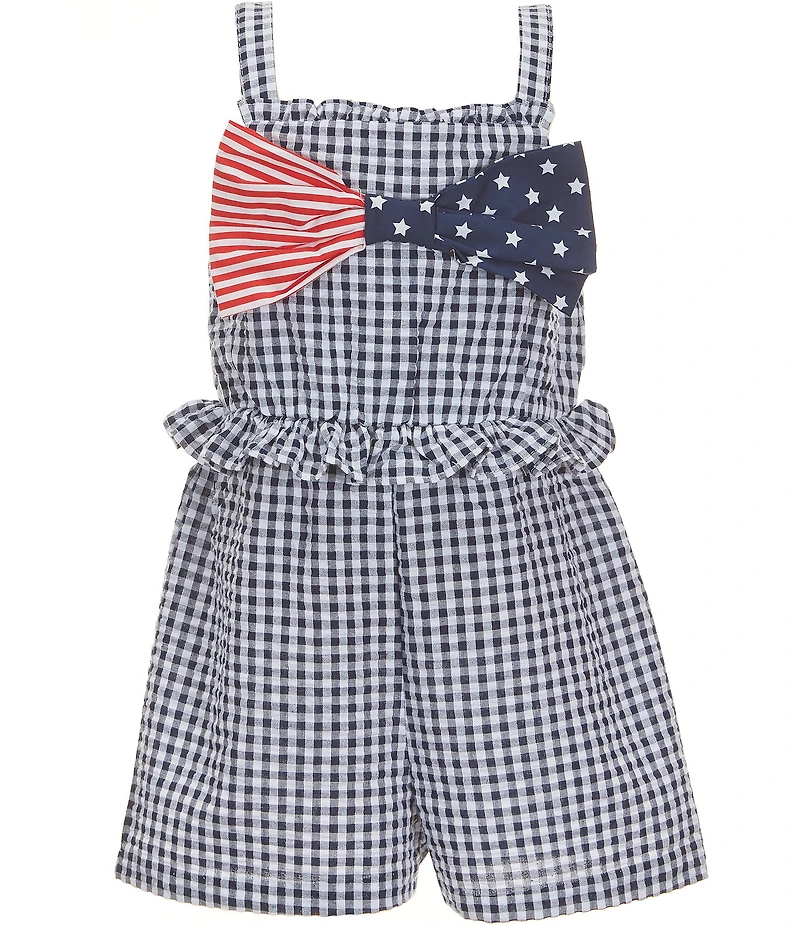 From Bonnie Jean, this romper features: Ruffled square neckline and waist Sleeveless Spaghetti straps Large Americana bow accent on the front Smocked back Pullover styling Cotton/polyester seersucker Machine wash/line dry Imported.