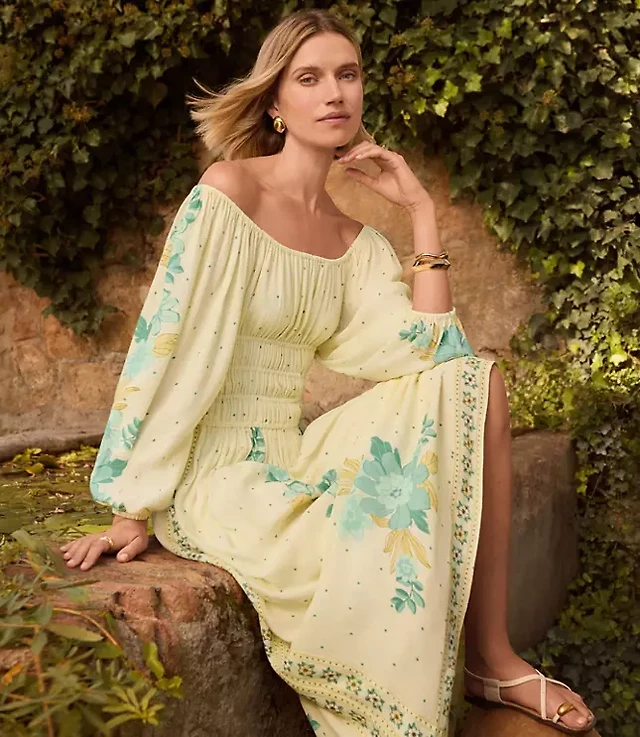 Shirred-Shoulder Smocked-Waist Midi Dress
