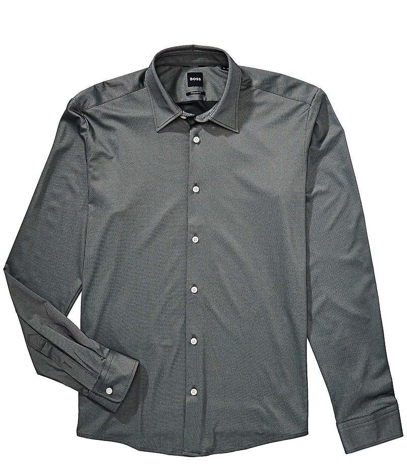 From BOSS, this shirt features: Spread collar Long sleeves Button-front closure Round cuffs and hem Regular fit Stretch fabric Polyamide/polyester/elastane Machine wash/line dry Imported.