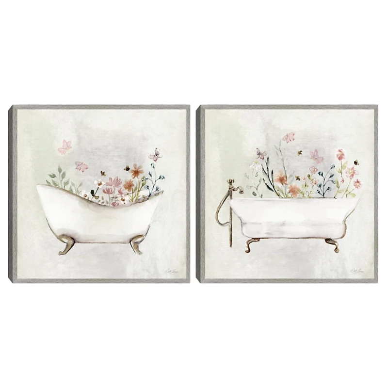 Make your bathroom bloom with these Botanical Bath Framed Canvas Art Prints. Alive with flowers and butterflies, these vintage tubs add a touch of whimsy to any space! Overall dimensions Width: 36 in. Depth: 1.5 in. Height: 36 in. Printed on stretched, polycotton blend canvas Gray frame around wrapped canvas Feature floral bath tubs Hues of white, gray, green, pink, orange, and blue Artist: Stella Chang Weight: 10 lbs. Hangs from back-mounted hardware; sawtooth hangers included Care: Dust with a soft, dry cloth. Avoid direct sunlight and heat sources. This item is available at Kirklands.com only, not available in stores. Please note: this item cannot be shipped to APO/FPO addresses.