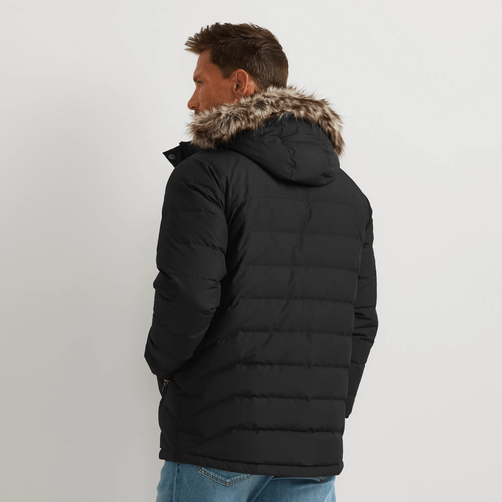 - Secure zip hand pockets set behind down insulation for added warmth