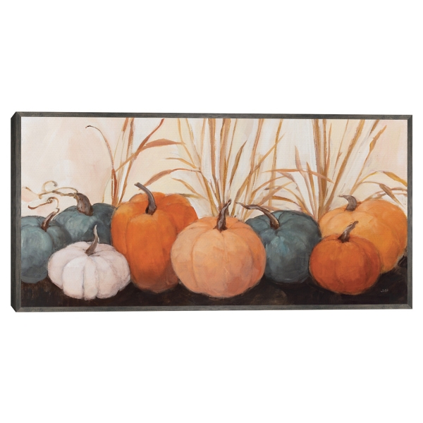 Create a beautiful focal point that invites guests to gather with this Bountiful Harvest Framed Canvas Art Print. Perfect for an entryway or dining space, this festive scene makes a warm, welcoming presence. Overall dimensions Width: 35 in. Depth: 1.5 in. Height: 18 in. Printed on stretched, polycotton blend canvas Steel-finished wood frame around wrapped canvas Features a pumpkins subject Hues of orange, blue, tan, and white Artist: Julia Purinton Weight: 4 lbs. Hangs from back-mounted hardware; sawtooth hangers included Care: Dust with a soft, dry cloth. This item is available at Kirklands.com only, not available in stores. Please note: this item cannot be shipped to APO/FPO addresses.