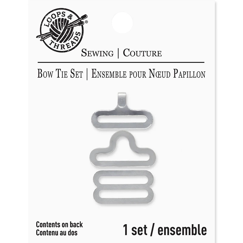 Use this set by Loops and Threads to make a customized adjustable bow tie. Choose a solid-colored or printed fabric for your bow tie and use it to accessorize a formal shirt. You can team this bow tie with a coordinating pocket square. Details:Includes 3 piecesSteelContents:HookEyeSlide adjuster