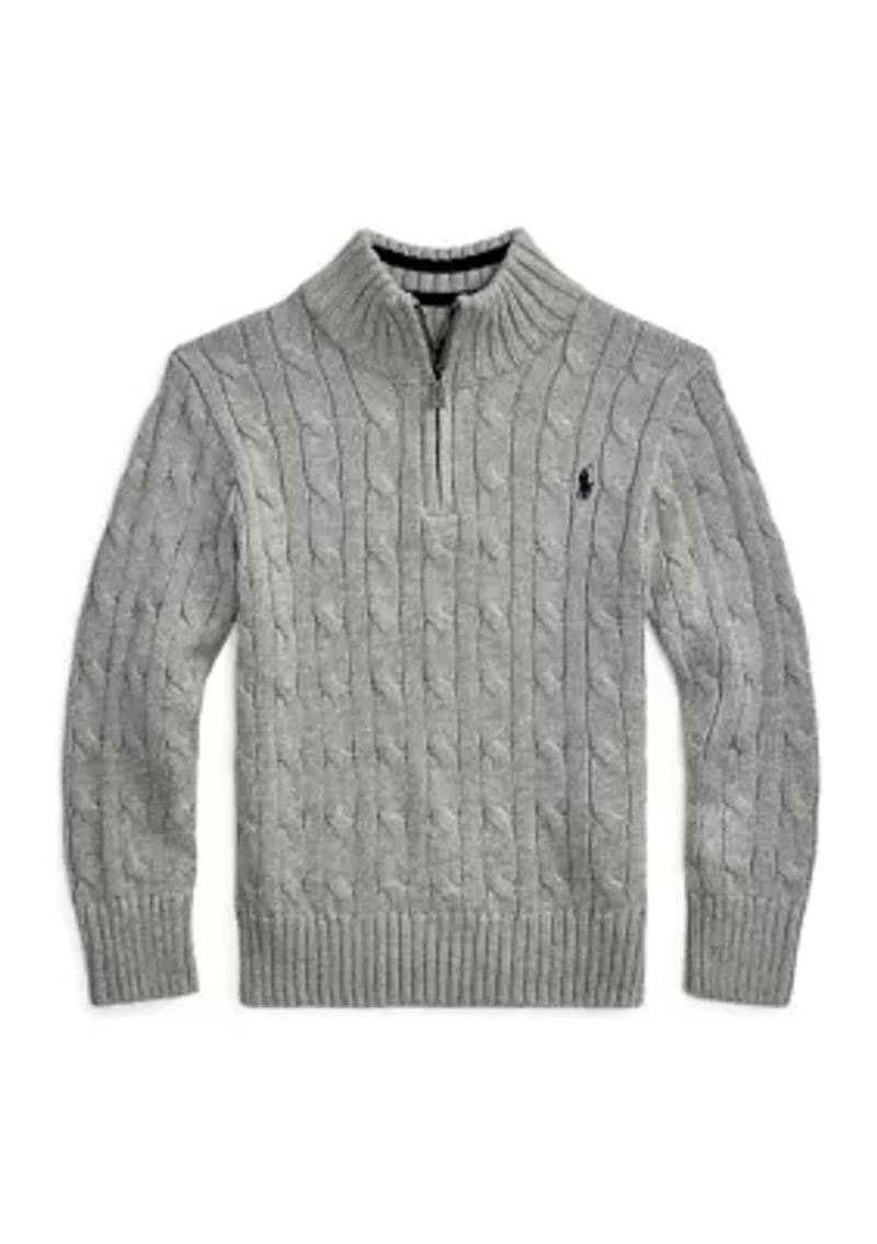 A smart pick for when temperatures dip, this cable-knit sweater is made from combed cotton and embroidered with Ralph Lauren Childrenswear's signature Pony. Size 4-4T has a 16" body length (front and back) and a 14" sleeve length Signature embroidered Pony at the left chest Rib-knit mock neck with striped facing Quarter-zip placket Long sleeves with rib-knit cuffs Rib-knit hem Imported Material & Care Cotton Machine washable