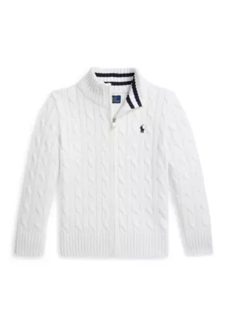 Perfect for when temperatures dip, this full-zip sweater from Ralph Lauren Childrenswear unites their signature cable-knit design with soft combed cotton. 100% cotton. Machine washable. Size 4 has a 16" body length (front and back) and a 14" sleeve length. Signature embroidered Pony at the left chest. Rib-knit mock neck with striped facing. Full-zip front. Zipper pulls custom-developed with a “Polo” logo. Long sleeves with rib-knit cuffs. Rib-knit hem. Imported. 100% cotton.
