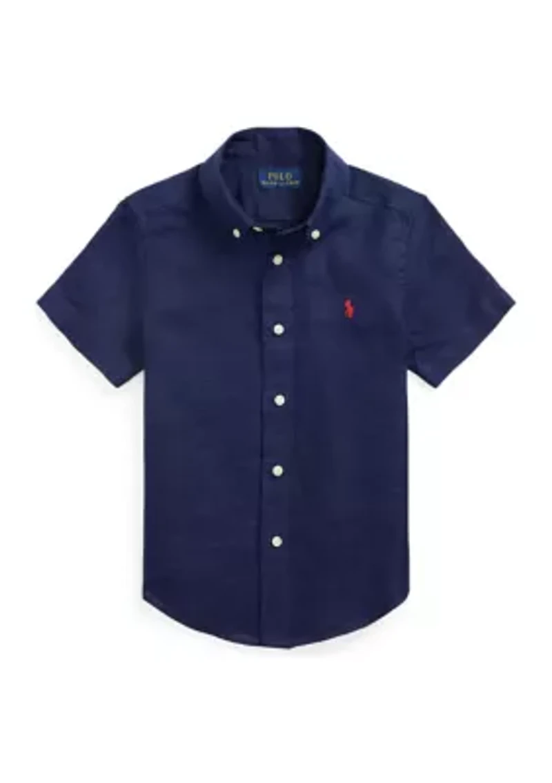 A staple of warm-weather style, this linen shirt is washed for enhanced softness and embroidered with Ralph Lauren Childrenswear's signature Pony. Size 4 has an 18.25" back body length Signature embroidered Pony at the left chest Button-down collar Buttoned placket Short sleeves Box-pleated back yoke Button closure Collar Short sleeves Imported Material & Care Linen Machine washable