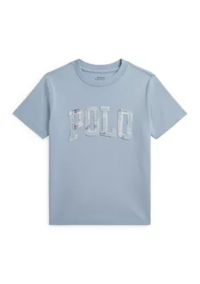 In soft cotton jersey, this Ralph Lauren Childrenswear crewneck t-shirt features their Polo logo rendered in indigo-hued patchwork appliqués. Crew neck Short sleeves Imported Product Specifications Size 4 has a 17" body length (front and back) Material & Care 100% cotton Machine washable