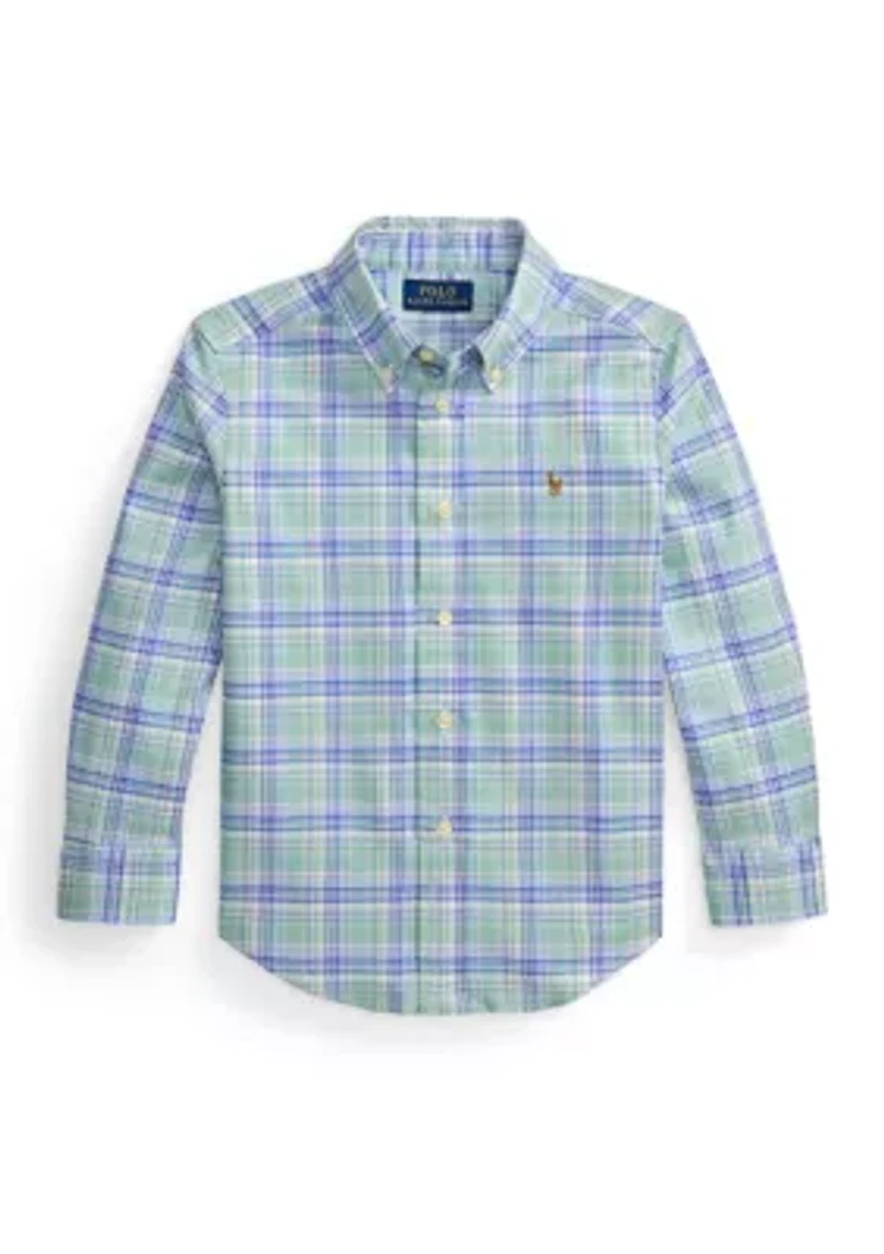 This Ralph Lauren Childrenswear plaid shirt is made with a cotton-blend Oxford cloth that’s developed with a hint of stretch as well as moisture-wicking properties. Multicolored signature embroidered Pony at the left chest Button closure Collared neck Long sleeves with buttoned barrel cuffs Box-pleated back yoke Plaid pattern Imported Product Specifications Sleeve length is taken from the center back of the neck Size 4 has an 18.25" back body length and a 21" sleeve length Material & Care 68% cotton, 30% lyocell, 2% elastane Machine washable