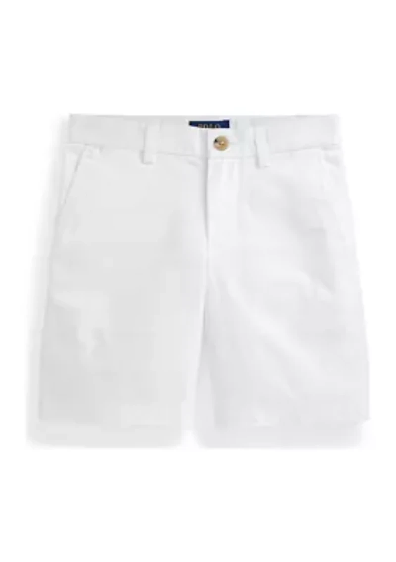 Cut for a slim fit from lightweight stretch chino, these Ralph Lauren Childrenswear shorts are a versatile wardrobe staple. Adjustable buttoned tabs at the interior ensure a room-to-grow fit Zip fly with a buttoned closure Belt loops Two front angled pockets Right hip coin pocket Two back buttoned pockets Signature embroidered Pony above the back right pocket Straight fit Imported Product Specifications Size 4/4T has a 5.5 in rise and a 5.75 in inseam Material & Care Cotton, elastane Machine washable