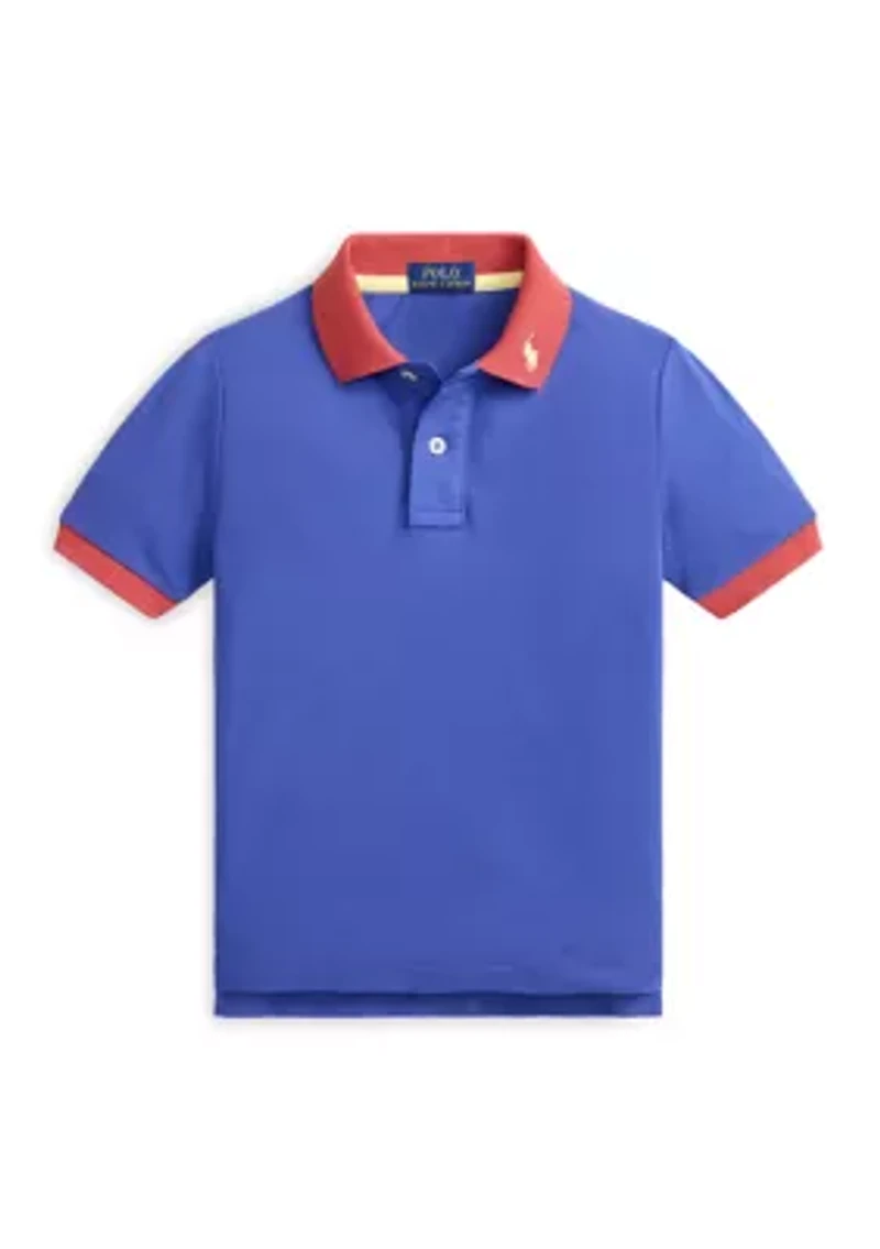 A playful update to Ralph Lauren Childrenswear's iconic Polo shirt, this stretch cotton mesh version features contrasting trim and their signature Pony at the collar. 100% cotton Machine washable Size 4 has a 17.75" front body length and an 18.5" back body length Signature embroidered Pony at the left collar Ribbed Polo collar Two-button placket Short sleeves with ribbed armbands Tennis tail Imported Imported