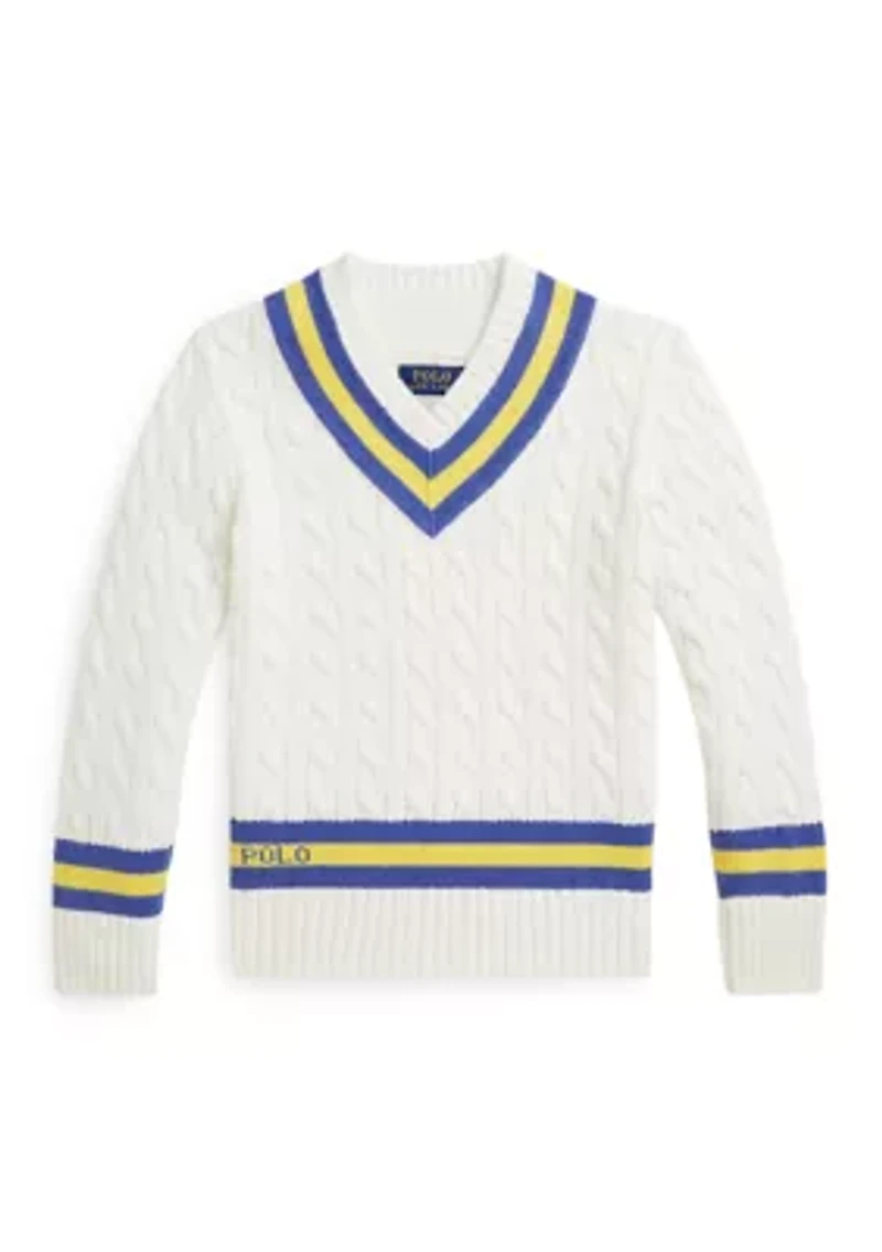 The Ralph Lauren Childrenswear cricket sweater is defined by its cable-knit pattern, as well as its V-neck and striped trim, which traditionally represents school or club colors. This cotton features all of these elements along with their “Polo” logo above the right hem. 100% cotton Machine washable Size 4 has a 16" body length (front and back) and a 14.25" sleeve length Striped rib-knit V-neck Long sleeves with striped rib-knit cuffs Striped rib-knit hem “Polo” logo knit above the right hem Imported Imported