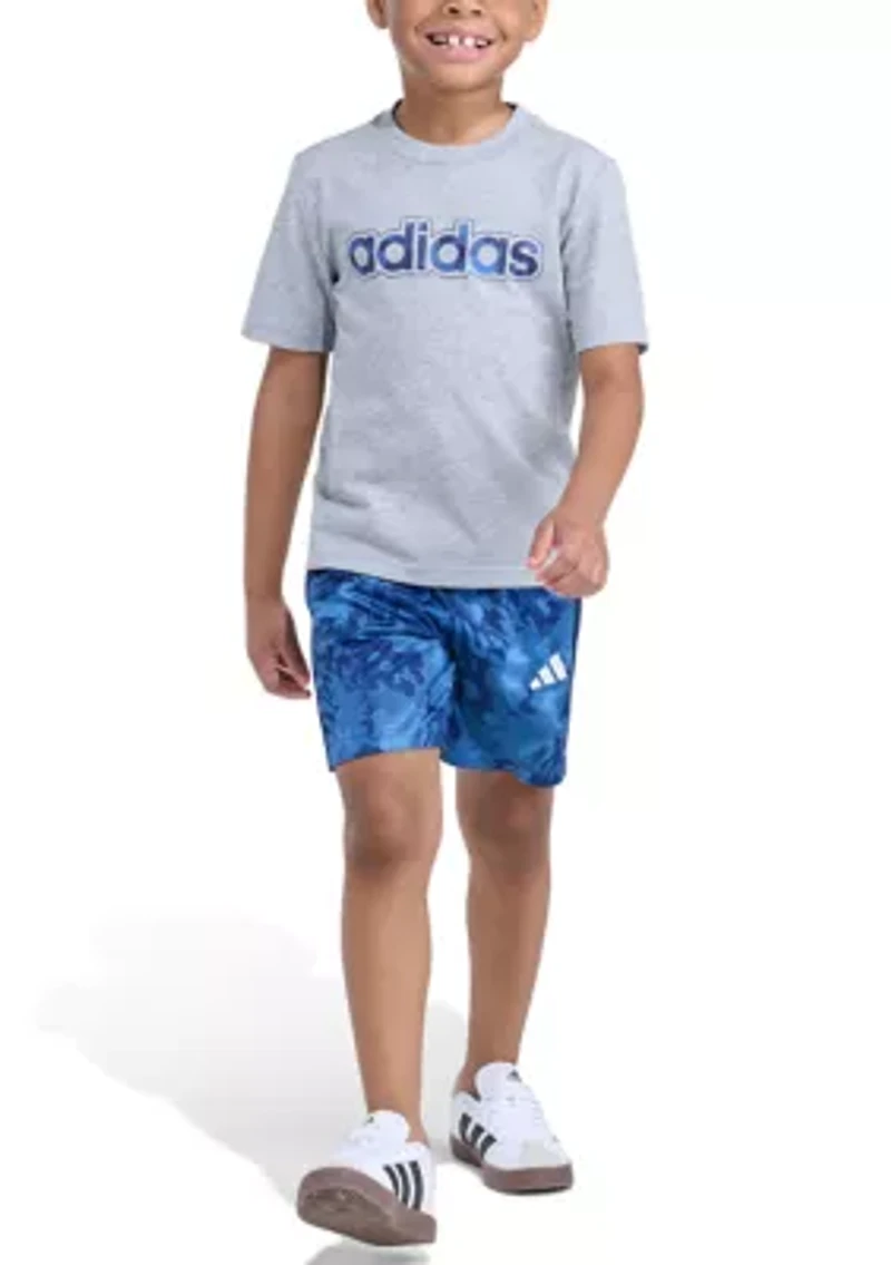 Keep your little one comfortable and stylish with this two-piece set from adidas. This outfit features a classic crew neck t-shirt and matching shorts with an elastic waistband for easy wear. Perfect for active boys, the set offers a comfortable fit and allows for unrestricted movement during playtime. 2-piece set Bottoms: elastic waistband, printed Top: crew neck, short sleeved, heather Imported Material & Care Cotton, polyester Machine washable