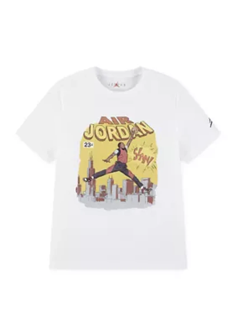 A comic-inspired slam dunk adds cool, sporty style to this Jordan graphic t-shirt. Pullover Crew neck Short sleeves Imported Material & Care Cotton, polyester Machine washable