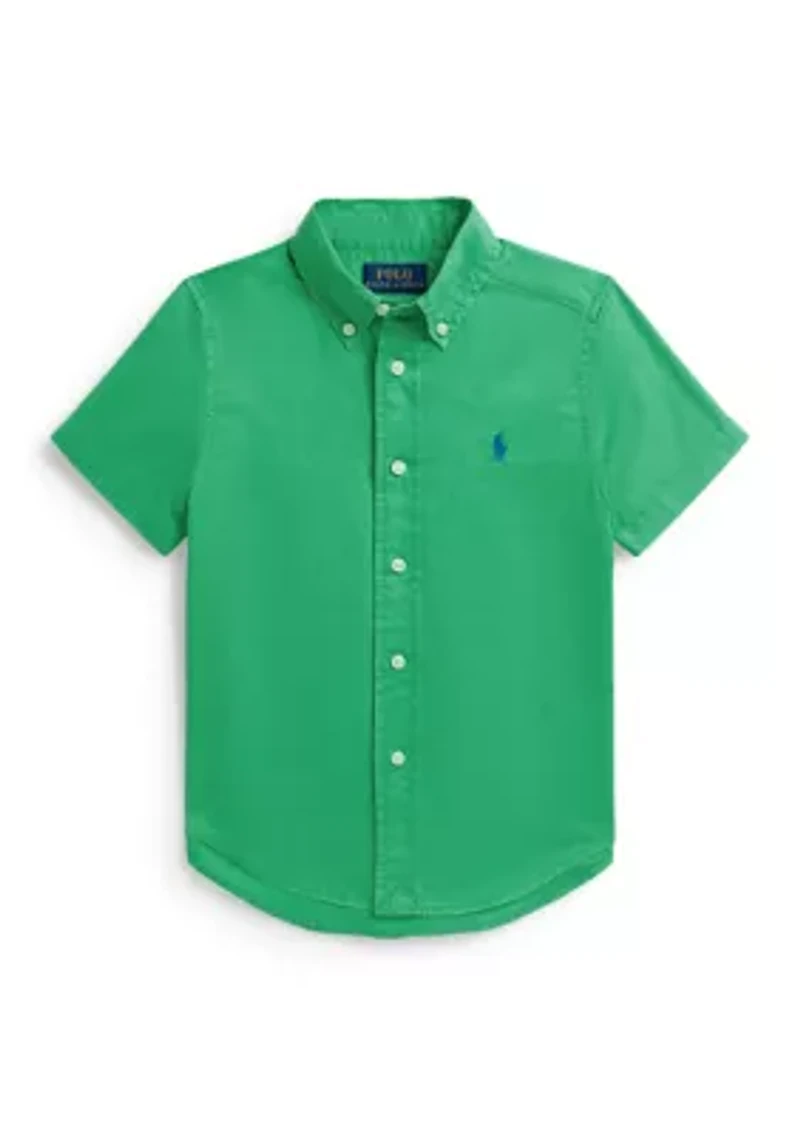 This Ralph Lauren Childrenswear cotton shirt is made from featherweight twill fabric and washed for added softness. On the left chest, the iconic Polo Pony is intricately embroidered. Button Button down collar Short sleeves Signature embroidered Pony at the left chest Imported Material & Care 100% Cotton Machine Washable