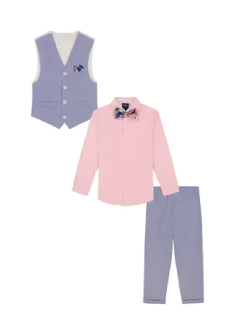 Clean up his act in an instant with this vest set from IZOD. It features a softly textured vest and pants with a long-sleeve dress shirt and a playful bowtie. 4-piece set Vest: button closure, V-neck, sleeveless, 3 welt pockets Shirt: button closure, collar, long sleeves Pants: elastic waistband Imported Material & Care Cotton, polyester Machine washable