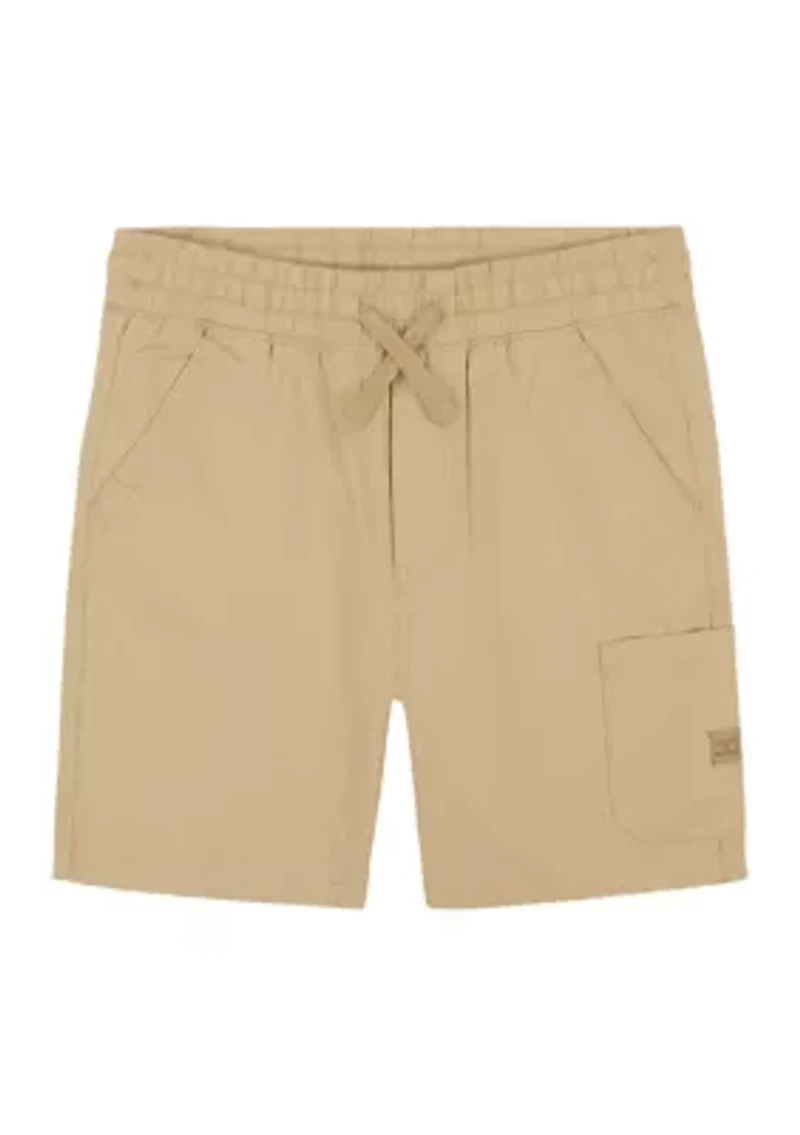 Keep him comfortable all day long with these awesome shorts from Lucky Brand. Pair it with his favorite t-shirt for a cool adventure-ready look. Drawstring elastic waistband 2 front slant pockets, 1 back welt pocket, 1 side cargo pocket Regular fit Straight leg Imported Material & Care Cotton, polyester Machine washable
