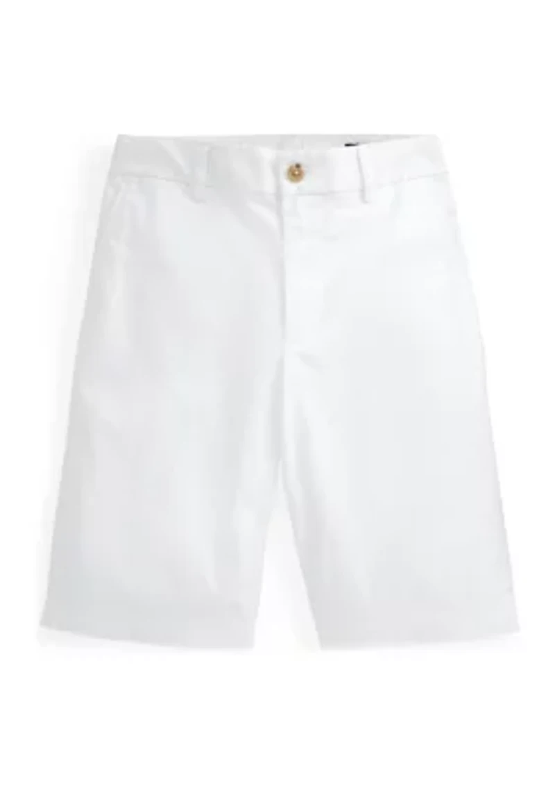 Cut for a slim fit from lightweight stretch chino, these Polo Ralph Lauren shorts are a versatile wardrobe staple. Zip fly with a buttoned closure Belt loops Sizes 8-12: adjustable buttoned tabs at the interior ensure a room-to-grow fit Two front angled pockets Right hip coin pocket Two back buttoned pockets Straight fit Imported Product Specifications Size 12 has a 7.75 in rise and a 9.25 in inseam Material & Care Cotton, elastane Machine washable