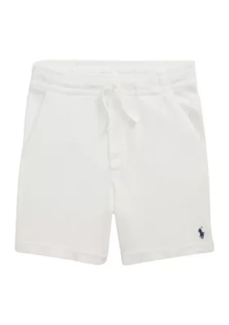 These shorts are made with lightweight cotton-blend terry and washed for added softness. At the left hem, they are finished with Ralph Lauren Childrenswear's signature embroidered Pony. By choosing Ralph Lauren Childrenswear's cotton products, you’re supporting the investment in the Better Cotton™ mission to help cotton communities survive and thrive while protecting and restoring the environment. This product is sourced via a system of mass balance and therefore may not contain Better Cotton™. Visit bettercotton.org/mass balance for more information about mass balance. Size medium has a 10.25" rise and a 5" inseam Signature embroidered Pony at the left hem Drawstring waistband Faux fly Two front angled pockets Back right patch pocket Imported Material & Care Cotton, polyester Machine washable